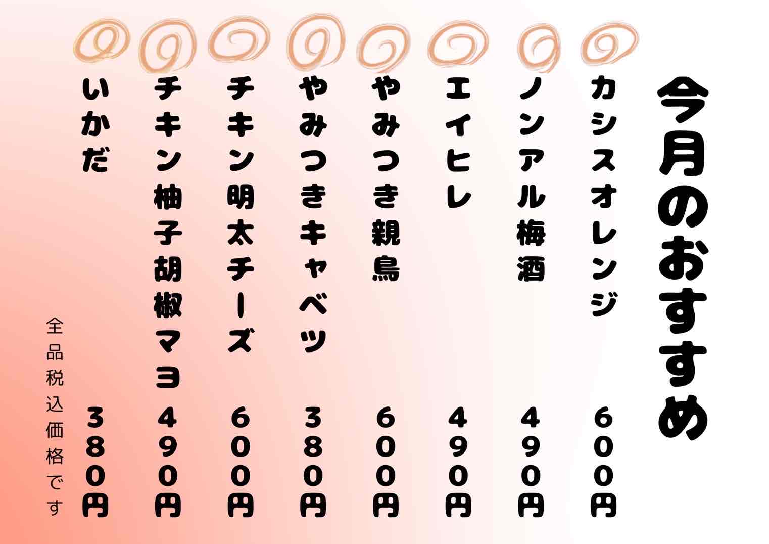 おススメメニューを変更しました。おろしささみ天などが追加されました。